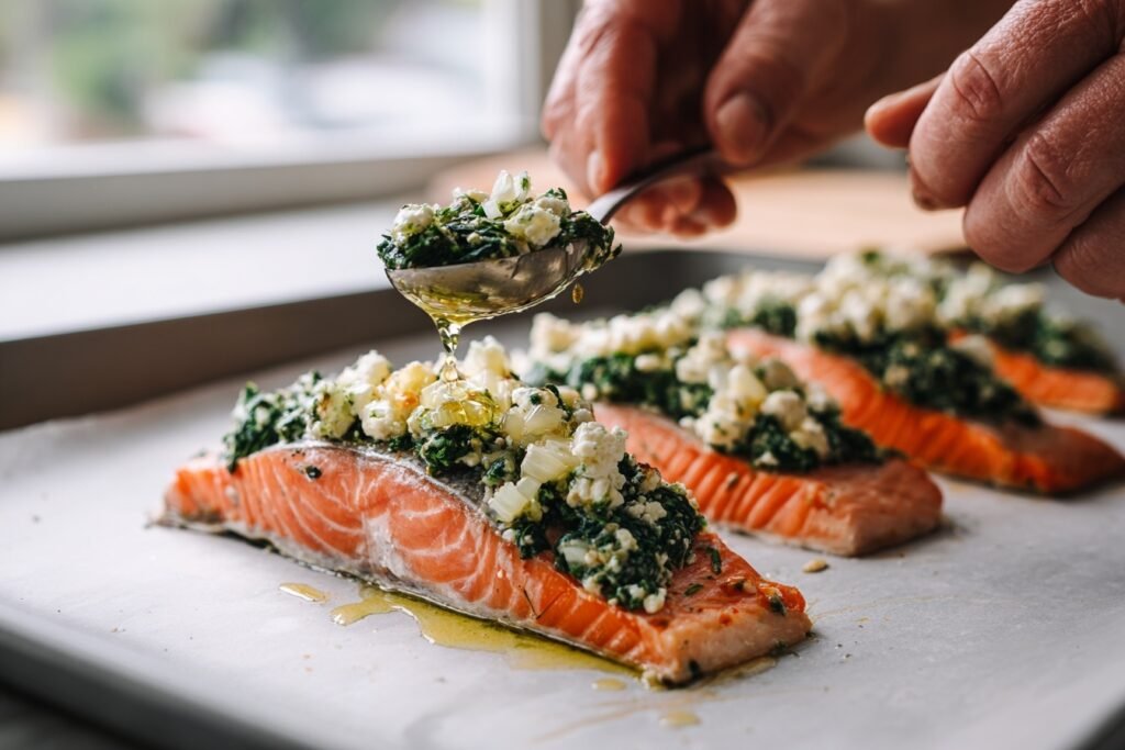 Variations keep it exciting: Swap spinach for kale for heartier chew, or add chopped sun-dried tomatoes to the stuffing for sweet umami. Try dill instead of oregano for a Scandinavian twist. For spice lovers, a pinch of red pepper flakes amps heat without overpowering. Each tweak makes Baked Stuffed Salmon with Spinach & Feta endlessly adaptable.