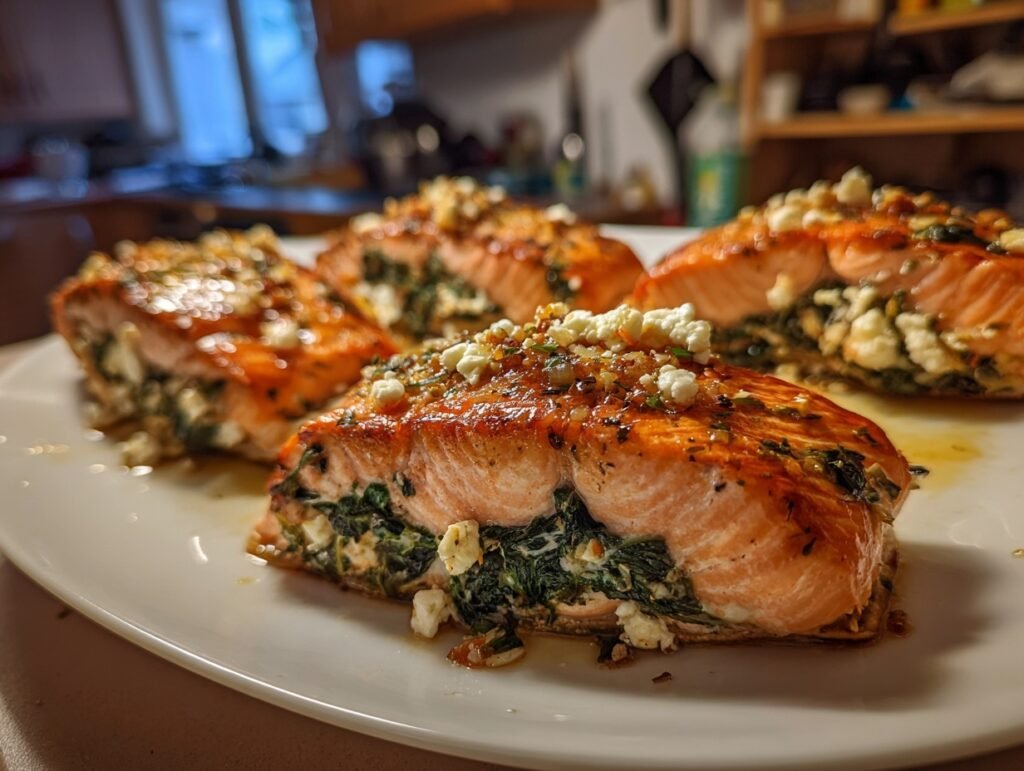 Imagine the golden, flaky layers of Baked Stuffed Salmon with Spinach & Feta emerging from the oven, steam rising with an intoxicating aroma of garlic, lemon, and herbs mingling in the air. The vibrant green spinach peeks through tender salmon fillets, dotted with creamy white feta crumbles that melt into every bite. One forkful delivers a burst of briny ocean freshness, earthy spinach tang, and zesty lemon brightness—pure bliss that makes your taste buds dance.