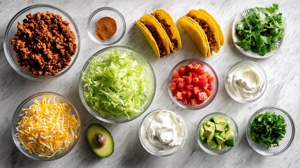 Simple, balanced ingredients make these tacos sing. Lean ground beef delivers rich, savory flavor; taco seasoning adds warmth and depth; shredded lettuce and diced tomatoes provide crisp, cooling contrast; cheese and sour cream bring creamy richness; avocado adds silky, buttery notes; cilantro brightens everything. Each element is small but essential to the composed flavor and visual appeal.
