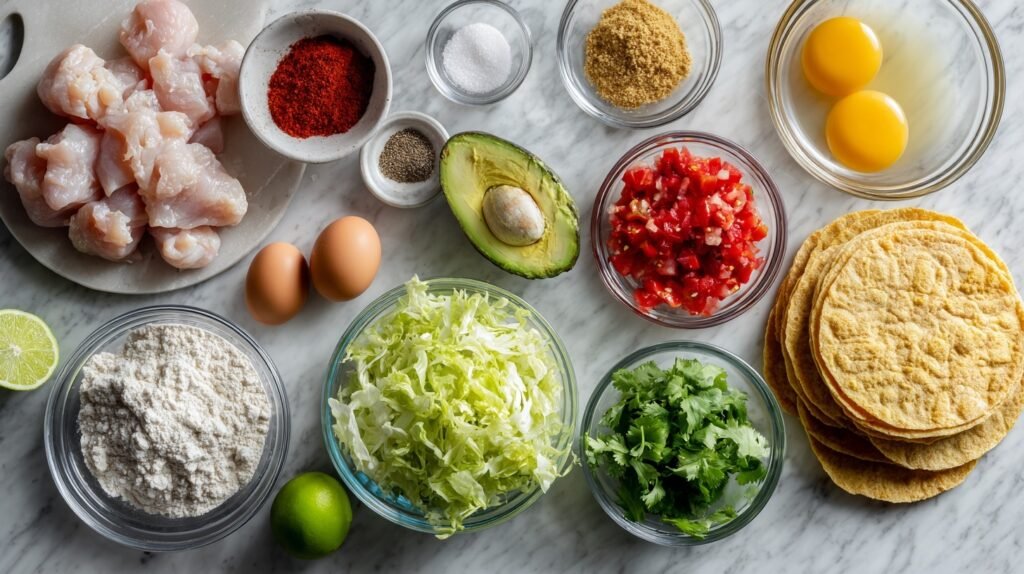 These ingredients harmonize perfectly for Crispy Chicken Tacos: tender chicken thighs get a spicy, seasoned flour dredge, egg wash, and panko crunch for unbeatable texture. Fresh veggies like lettuce, tomatoes, cilantro, and avocado add cool contrast and creaminess, while lime wedges brighten every bite. Corn tortillas provide an authentic, soft base—simple staples that deliver restaurant-level wow.