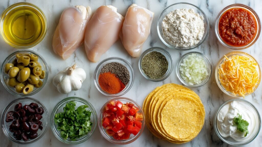 These ingredients harmonize beautifully: lean chicken breasts provide protein-packed filling, while olive oil-sautéed onions and garlic build a savory base. Warm spices like chili powder and cumin create that signature smoky depth in the red sauce, balanced by crushed tomatoes and broth for silky texture. Corn tortillas add authentic chew, cheddar melts luxuriously, and sour cream with cilantro brings creamy freshness—topped with vibrant jalapeños, tomatoes, and olives for crunch and zing.