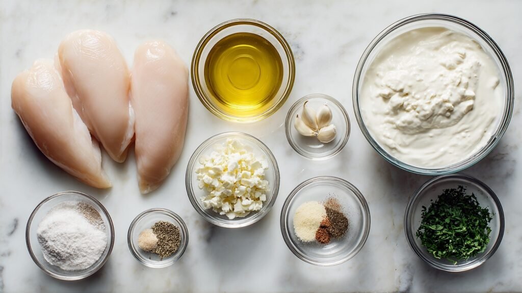 These simple pantry-friendly ingredients team up to create a rich, balanced sauce that highlights the chicken. Heavy cream gives the sauce luxurious body, garlic brings bold aromatic depth, and Italian seasoning rounds everything with herbs. Olive oil sears the chicken to a caramelized finish while garlic powder and onion powder boost savory notes for a well-rounded, comforting profile.