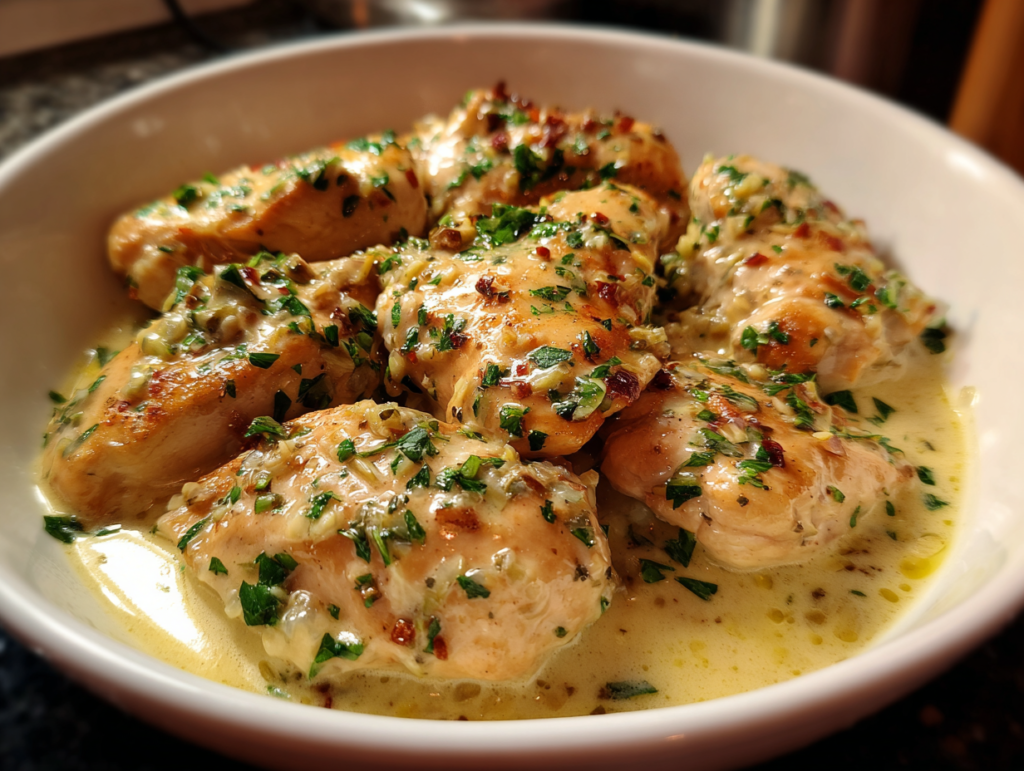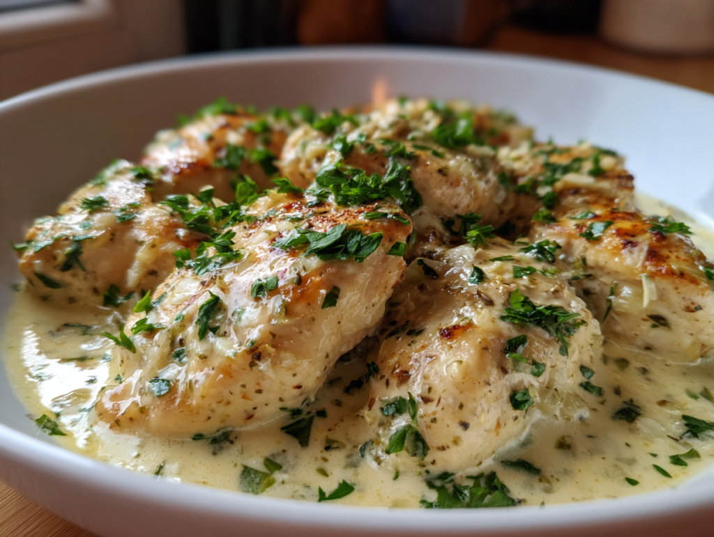 The kitchen fills with a warm, garlicky perfume the moment the skillet hits the stove — silky cream simmering into glossy ribbons around golden chicken. Creamy Garlic Chicken arrives like a hug on a plate: pale, satin sauce flecked with fresh parsley, tender white meat glistening, steam carrying promises of comfort and richness. One bite brings a rush of savory garlic, lush dairy, and a whisper of Italian herbs that make forks pause and smiles spread.