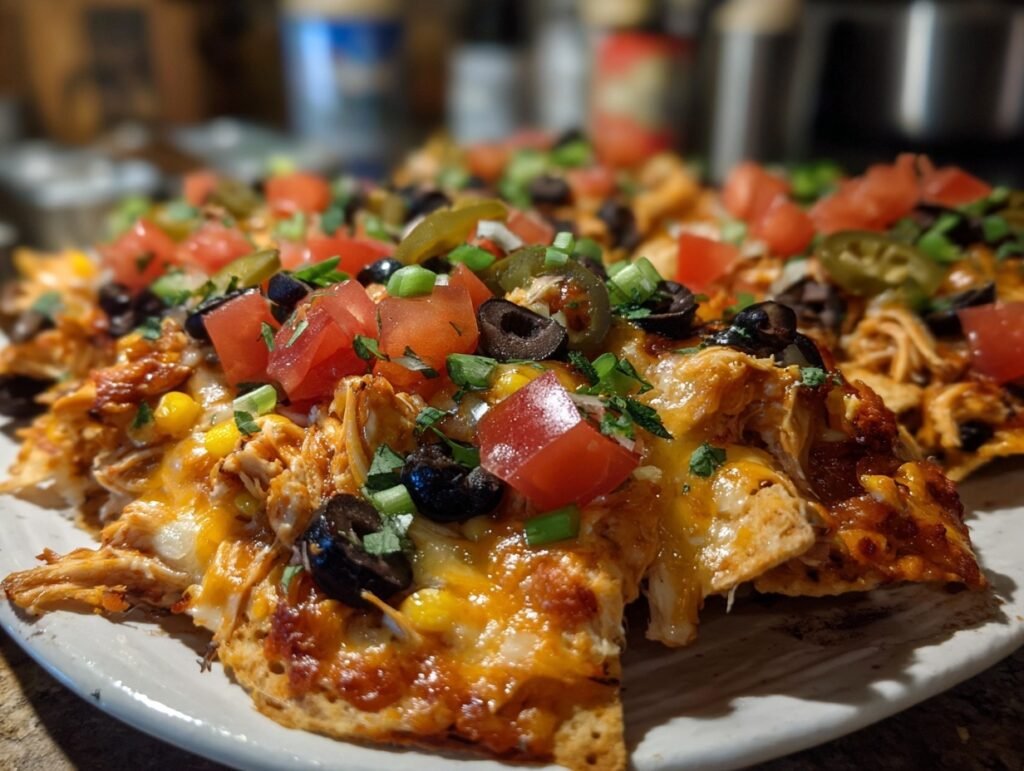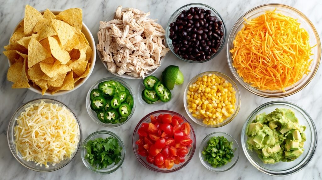 These ingredients harmonize perfectly: hearty tortilla chips provide crunch, tender chicken adds protein-packed savoriness, and two cheeses melt into a velvety blanket. Black beans and corn bring earthy sweetness, while tomatoes, olives, jalapeños, and herbs add fresh zing. Topped with creamy avocado, sour cream, and salsa, every bite bursts with layered flavors and textures.