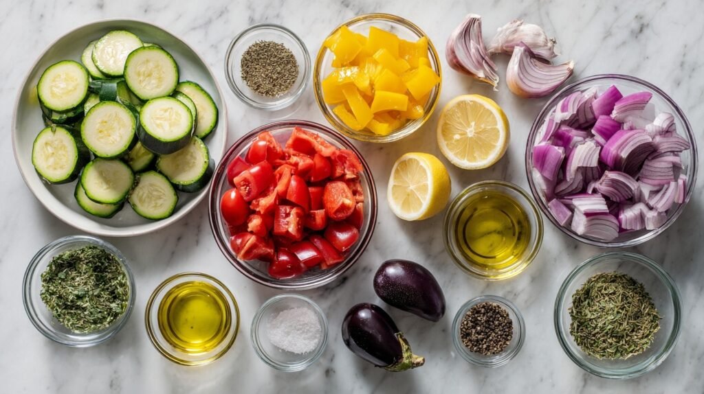 These ingredients create a symphony of summer flavors—earthy eggplant and zucchini soak up the garlicky, oregano-spiced marinade, while sweet cherry tomatoes and bell peppers add juicy pops of color and tang. Red onion brings sharp contrast, all unified by olive oil’s richness and lemon’s zing for smoky, irresistible Grilled Vegetable Kabobs.