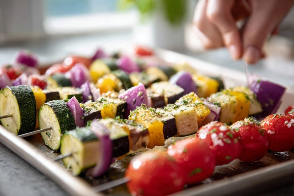 5. Thread vegetables onto 8 metal or soaked wooden skewers, alternating colors—zucchini, bell pepper, onion, tomato, eggplant—for a rainbow effect. Leave small gaps for even cooking.