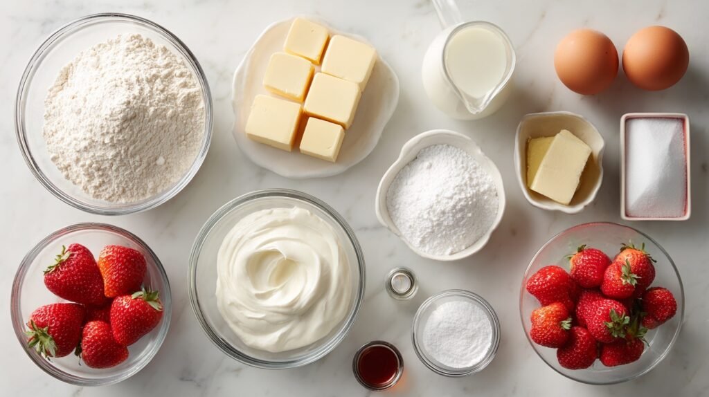 These simple, wholesome ingredients unite in perfect harmony: the flour, butter, and milk form tender, flaky shortcake biscuits with a subtle sweetness, while fresh strawberries macerate into a luscious compote that soaks in just right. Heavy cream whips into clouds of indulgence, balanced by vanilla’s warmth—creating a dessert that’s fresh, creamy, and utterly craveable.