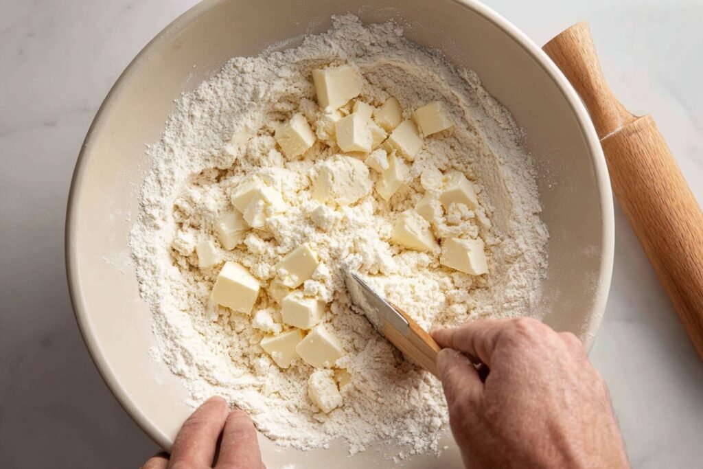 3. Cut in butter: Add cold cubed butter to the dry mix. Use a pastry cutter or fork to work it in until the mixture resembles coarse crumbs with pea-sized butter pieces. Cold butter creates flaky layers.