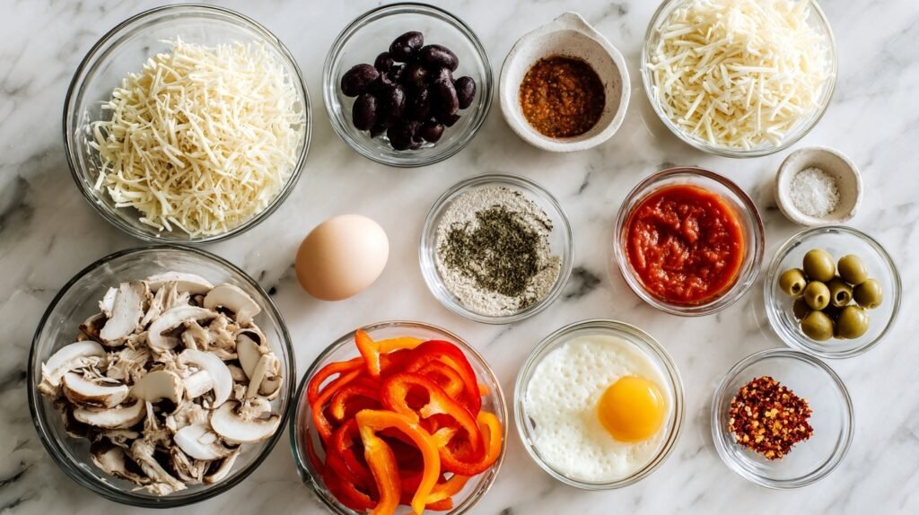 These ingredients harmonize beautifully in Chicken Crust Pizza: shredded chicken forms a sturdy, flavorful base, cheeses bind for chewiness, and egg ensures cohesion. Garlic powder, Italian seasoning, salt, and pepper infuse herby depth, while fresh veggies add crunch and color atop tangy sauce—creating a low-carb dream that’s hearty yet light.