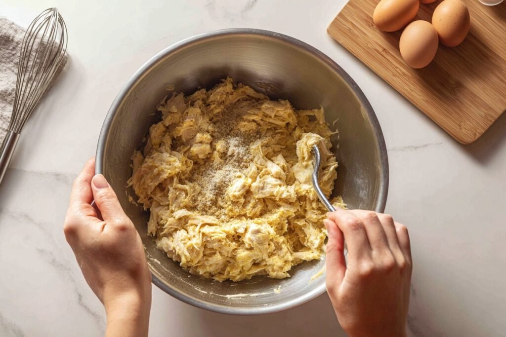 2. Prep chicken mixture: In a large bowl, combine 2 cups shredded chicken, 1/2 cup mozzarella, 1/2 cup Parmesan, 1 egg, garlic powder, Italian seasoning, salt, and pepper. Mix until sticky and uniform—like a dough that smells heavenly herby.