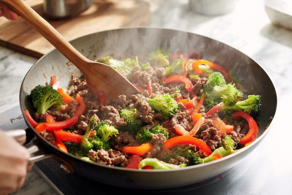 Don’t overcook! Brown just until no pink, about 5 minutes on high heat. Stir constantly and use medium-lean beef. Resting off-heat tenderizes it perfectly in this quick stir-fry.