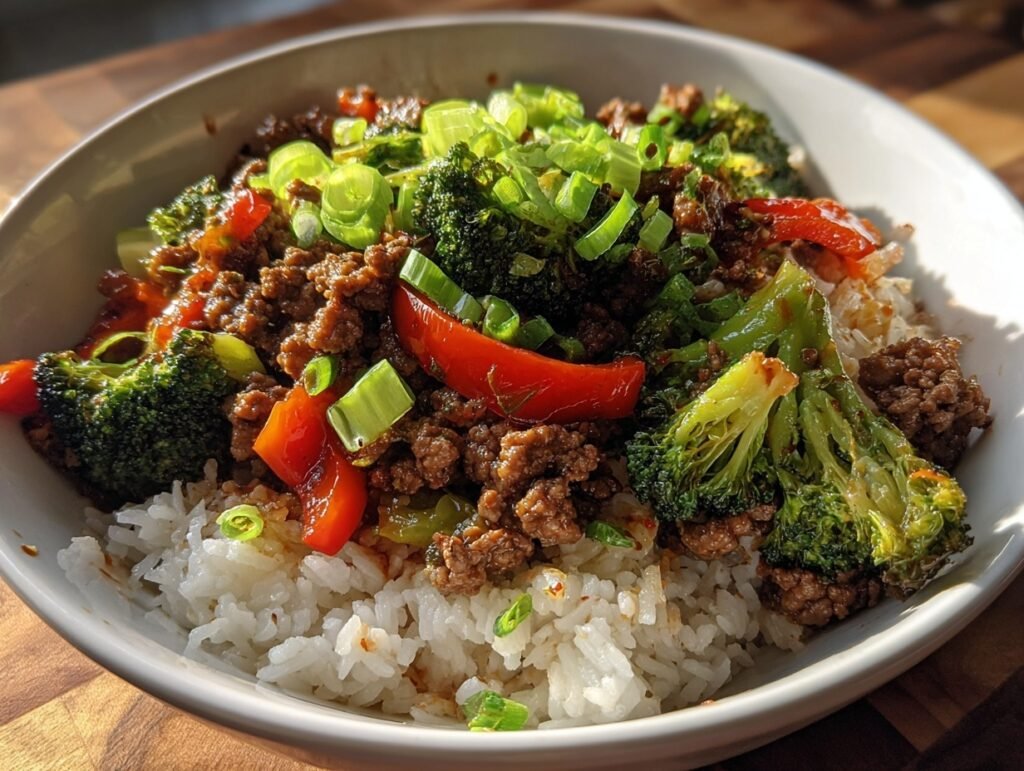 Packed with lean protein from ground beef, this Spicy Ground Beef Stir-Fry Bowl fuels muscles and keeps you full. Bell peppers and broccoli deliver vitamins A and C for glowing skin and immunity, while garlic and ginger fight inflammation with antioxidants. Jasmine rice provides steady energy, soy adds heart-healthy isoflavones—it’s a nutrient powerhouse in bowl form.