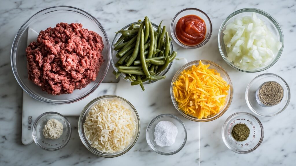 These everyday ingredients create a balanced, comforting casserole. Ground beef brings savory depth, rice adds body and stretch, diced tomatoes deliver tang and moisture, and green beans contribute freshness and color. Shredded cheddar melts into a glossy golden crown, while onion, garlic powder, salt, and pepper round everything out with warmth.