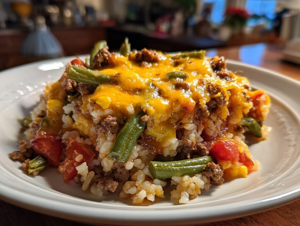 This casserole delivers a satisfying balance of protein, carbs, and fats thanks to ground beef, rice, and cheese. Ground beef offers iron and B vitamins, rice provides quick-release energy, and green beans contribute fiber and vitamin C. Onions and tomatoes add natural sweetness and color.
